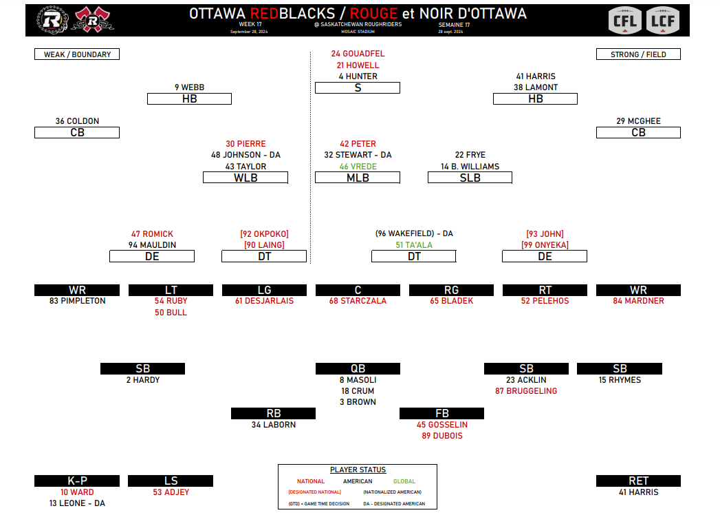 The Ottawa Redblacks will look profoundly different when they face Saskatchewan on Saturday, with six new starters from last week.