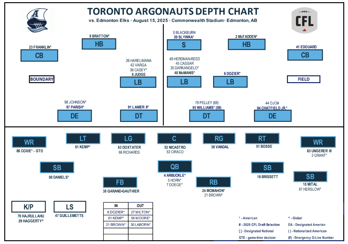Also making his Toronto debut is veteran strong-side linebacker Branden Dozier, who was signed earlier this week after beginning the year with the Ticats. He’ll bump Canadian Tyshon Blackburn back to backup safety, while fellow national Jonathan Edouard balances the ratio by making his first start of the year at field cornerback. Tarvarus McFadden moves to field halfback, while Mark Milton drops off the roster as a healthy scratch.