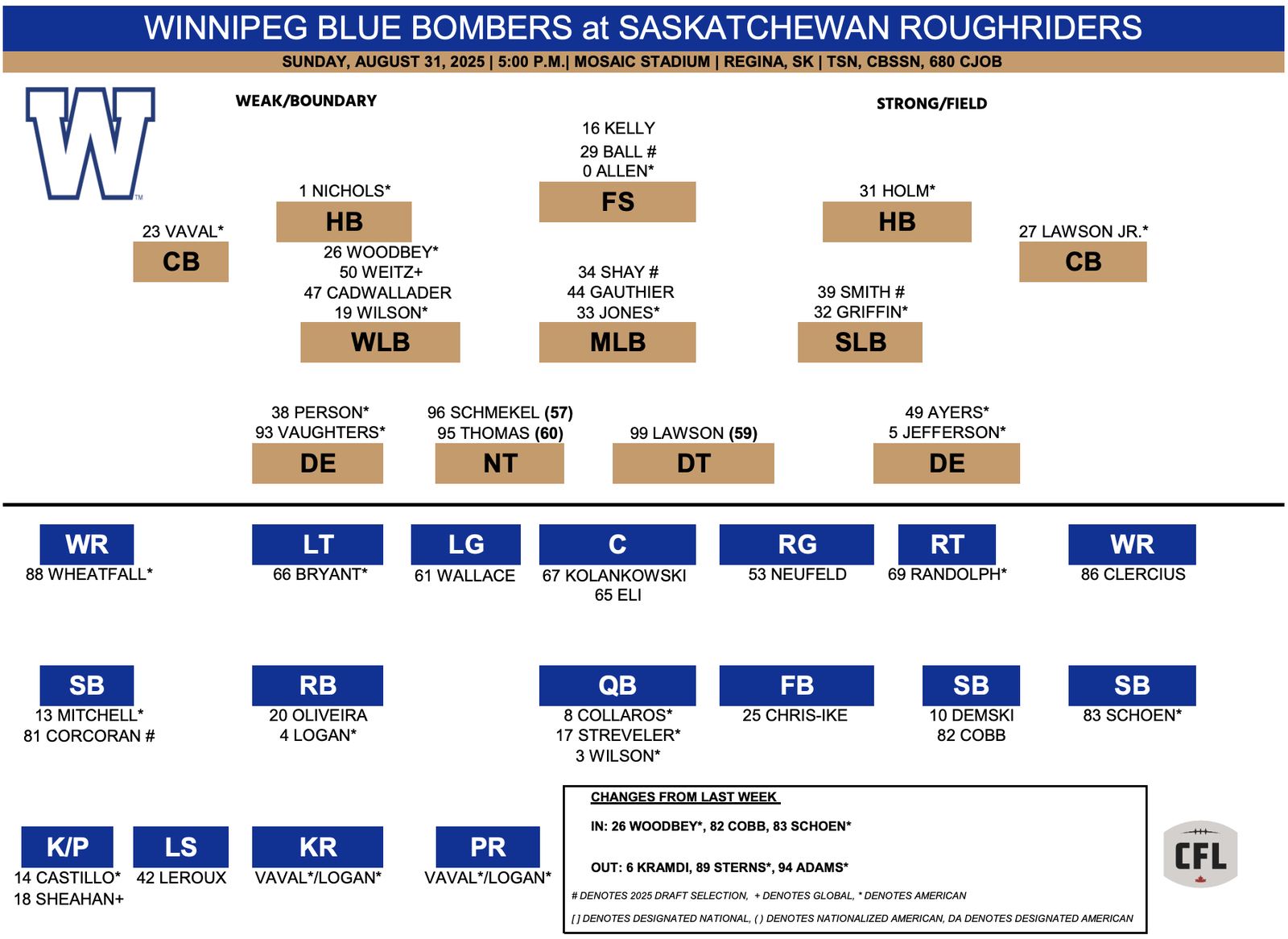 The weather forecast in Regina calls for a high of 27 degrees with a mix of sun and cloud. The game will be broadcast on TSN in Canada, CBS Sports Network in the United States, and CFL+ internationally. Radio listeners can tune-in on 680 CJOB in Winnipeg and 620 CKRM in Regina.