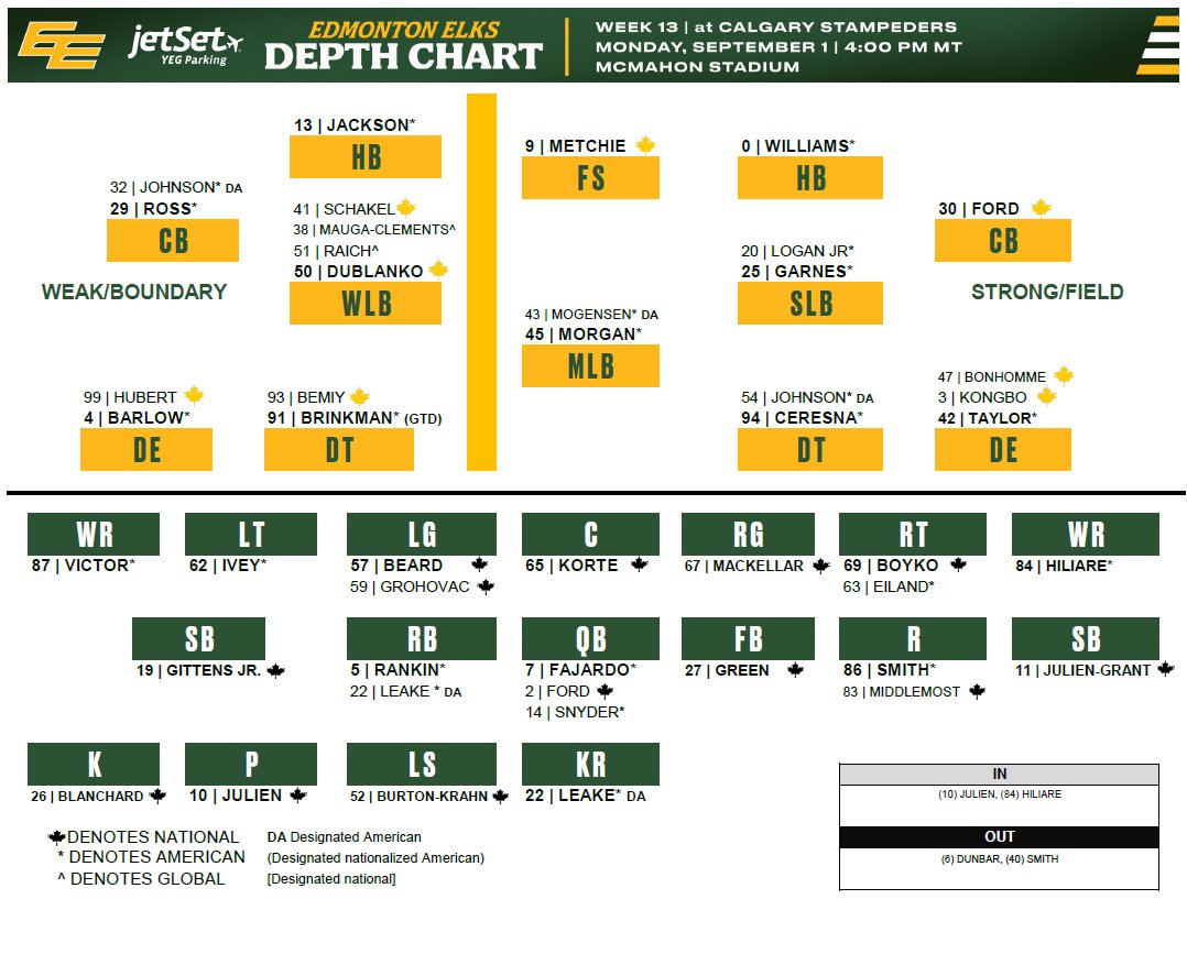 On special teams, all-star Canadian punter Jake Julien makes his return from the NFL, while Global specialist Cody Grace remains on the six-game injured list. That will allow kicker Vincent Blanchard to focus exclusively on his regular duties.