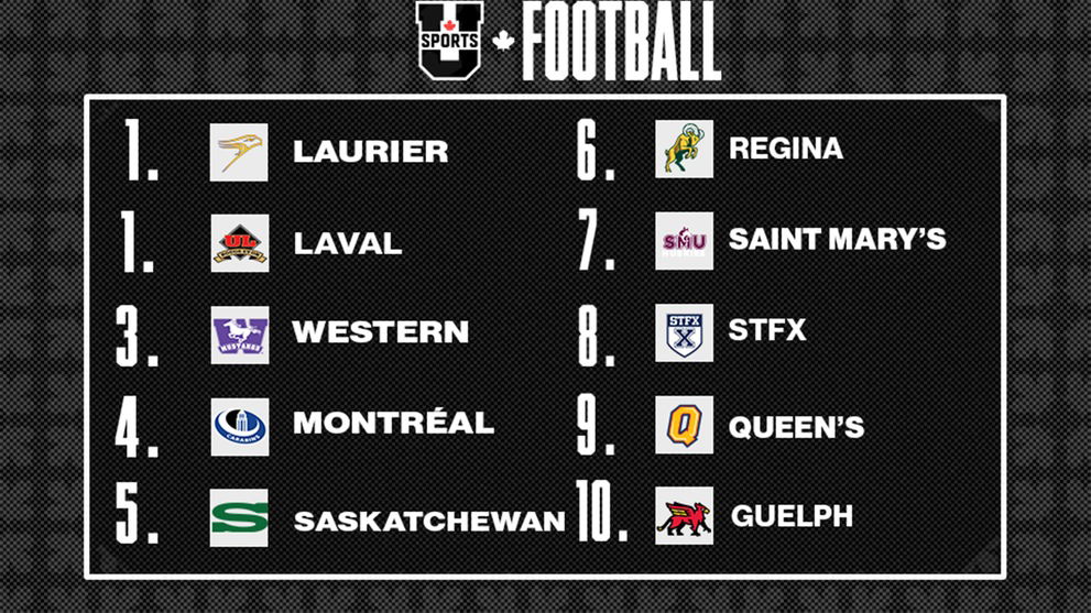 The top four spots in the U Sports football rankings remained unchanged with the Laurier Golden Hawks, Laval Rouge et Or, Western Mustangs, and Montréal Carabins reigning supreme. The Queen’s Gaels fell from No. 6 to No. 9 after a 47-32 loss to the Laurier Golden Hawks, while the Saint Mary’s Huskies rose from No. 10 to No. 7 after crushing the Bishop’s Gaiters by a score of 33-7.