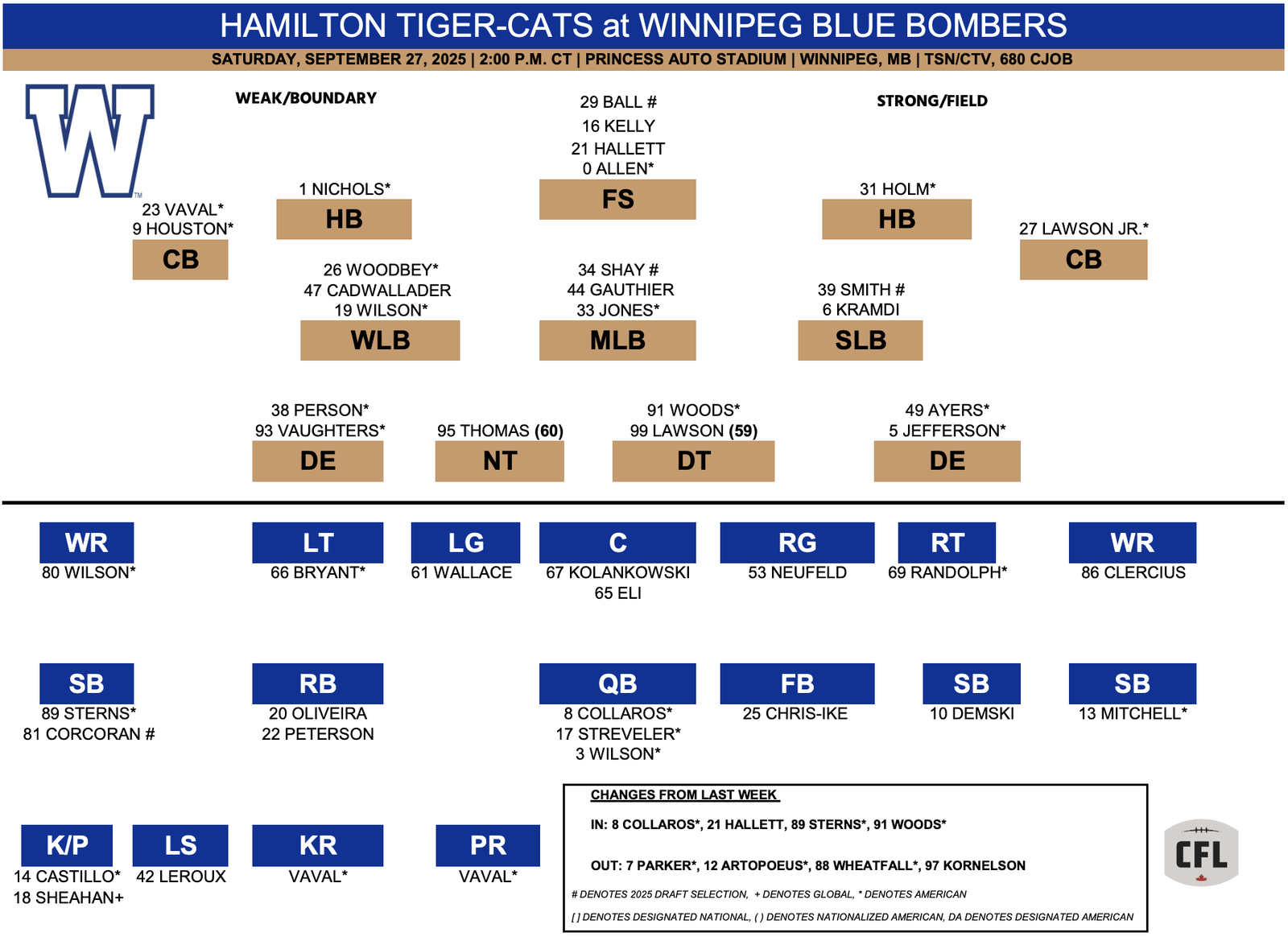 Winnipeg made three other changes to the roster, adding receiver Jerreth Sterns from the one-game injured list, defensive lineman Jamal Woods from the practice roster, and defensive back Nick Hallett from the one-game injured list. Sterns will start in place of the injured Keric Wheatfall, while Woods and Hallett will fill depth roles.