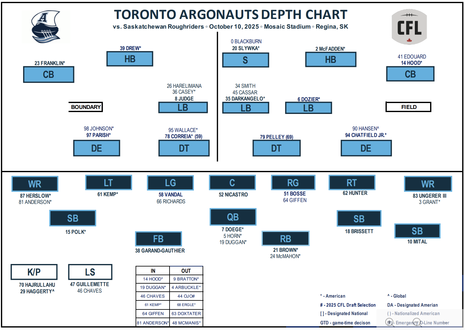The Argonauts have made two changes along the offensive line after giving up nine sacks last week with Brandon Kemp returning from injury and Sage Doxtater moving to the one-game injured list due to an elbow problem. Kemp will start at left tackle where Hampton Ergle, who have been moved back down to the practice roster, struggled last week. John Bosse, who was a third-round pick in the 2024 CFL Draft out of the University of Calgary, will start at right guard.