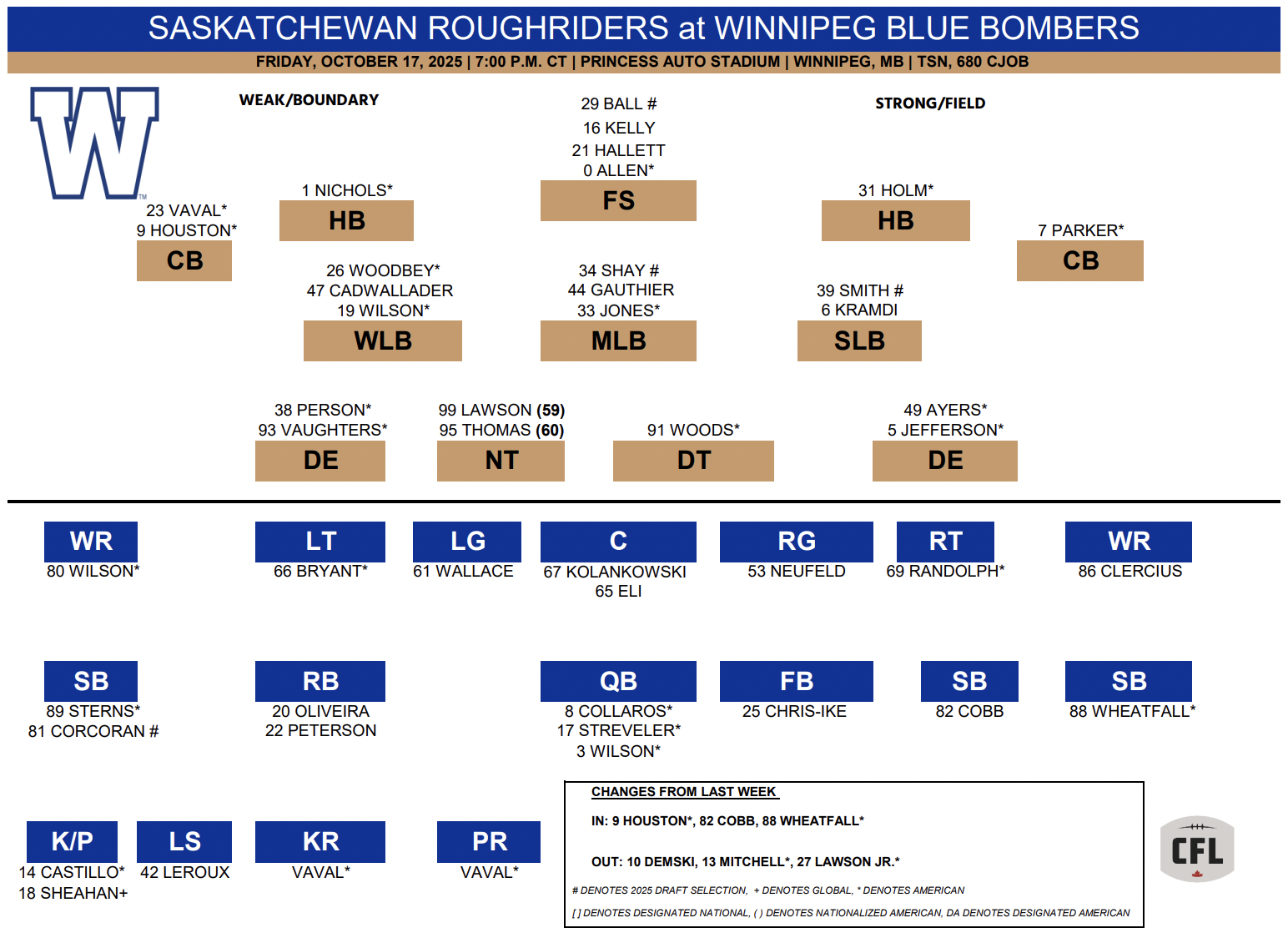 Houston didn’t dress for the team’s loss to the Edmonton Elks last week after he was late coming back from the bye week due to personal reasons. The veteran defender, who has recorded 11 defensive tackles over three regular-season games this year, will start at boundary cornerback opposite Jamal Parker, who will start at field-side cornerback.