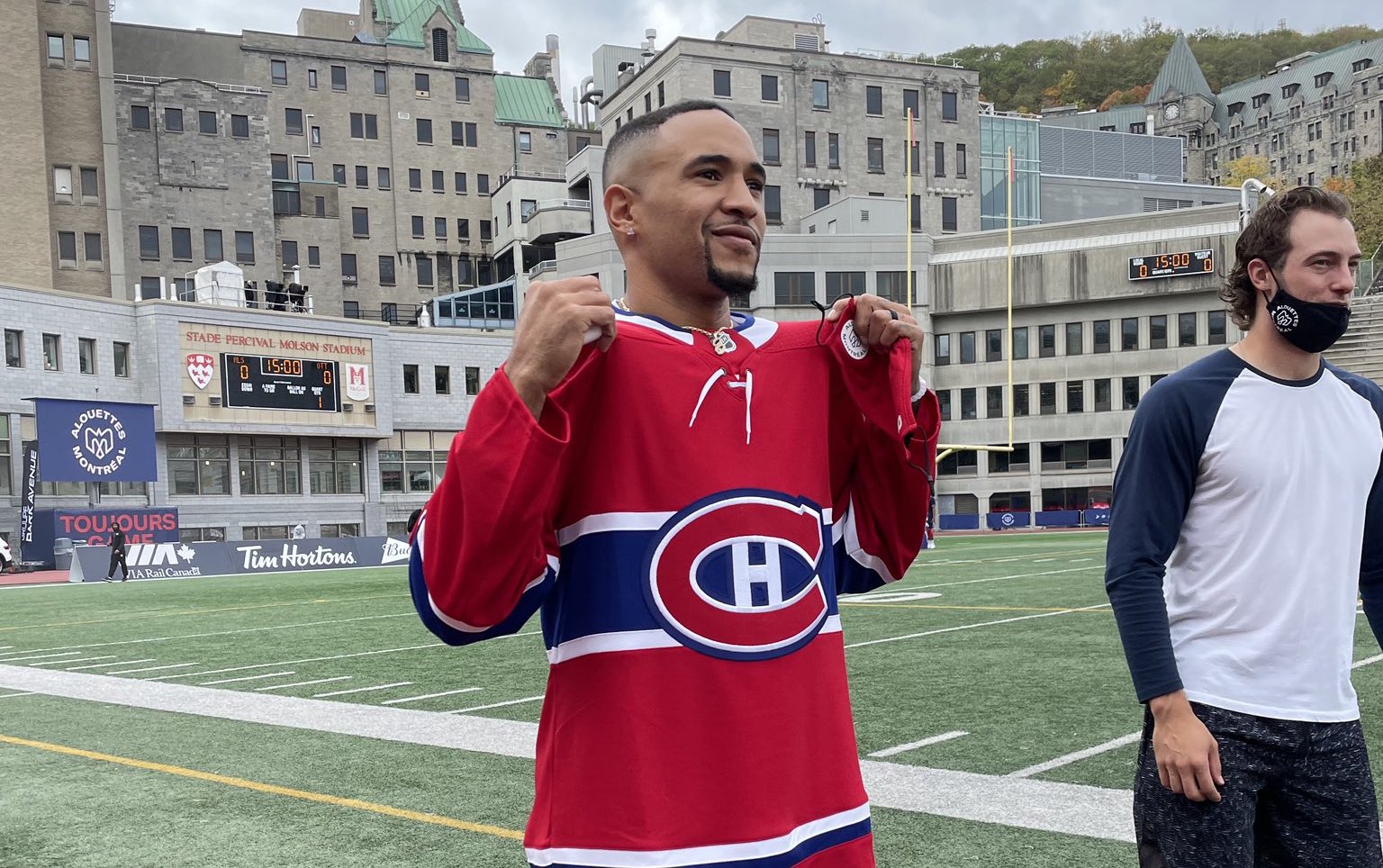 Montreal Alouettes’ quarterback Vernon Adams Jr. showed his support for Montreal Canadiens’ goaltender Carey Price on Monday. Adams Jr. wore a...