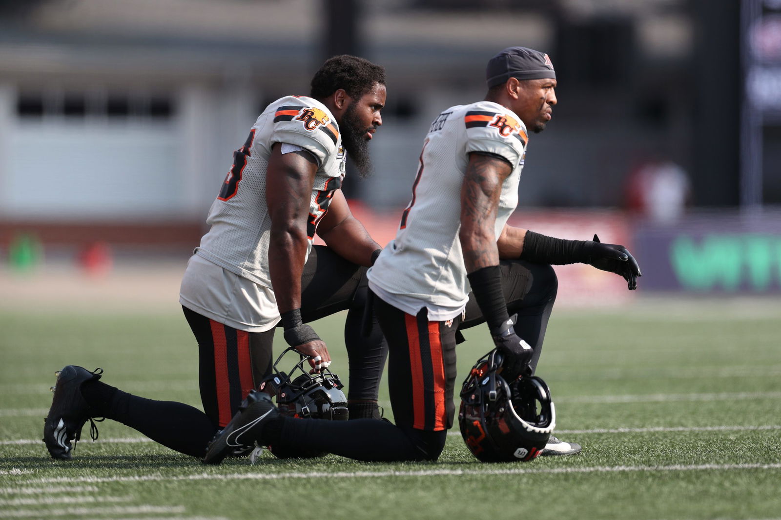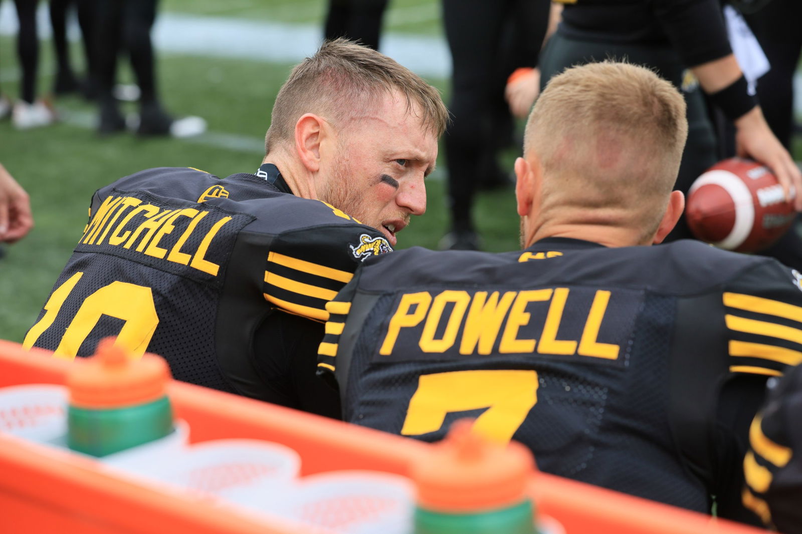Hamilton Tiger-Cats’ players Luther Hakunavanhu and Taylor Powell, both of whom suffered apparent head injuries during Saturday night’s 47-22 loss to...